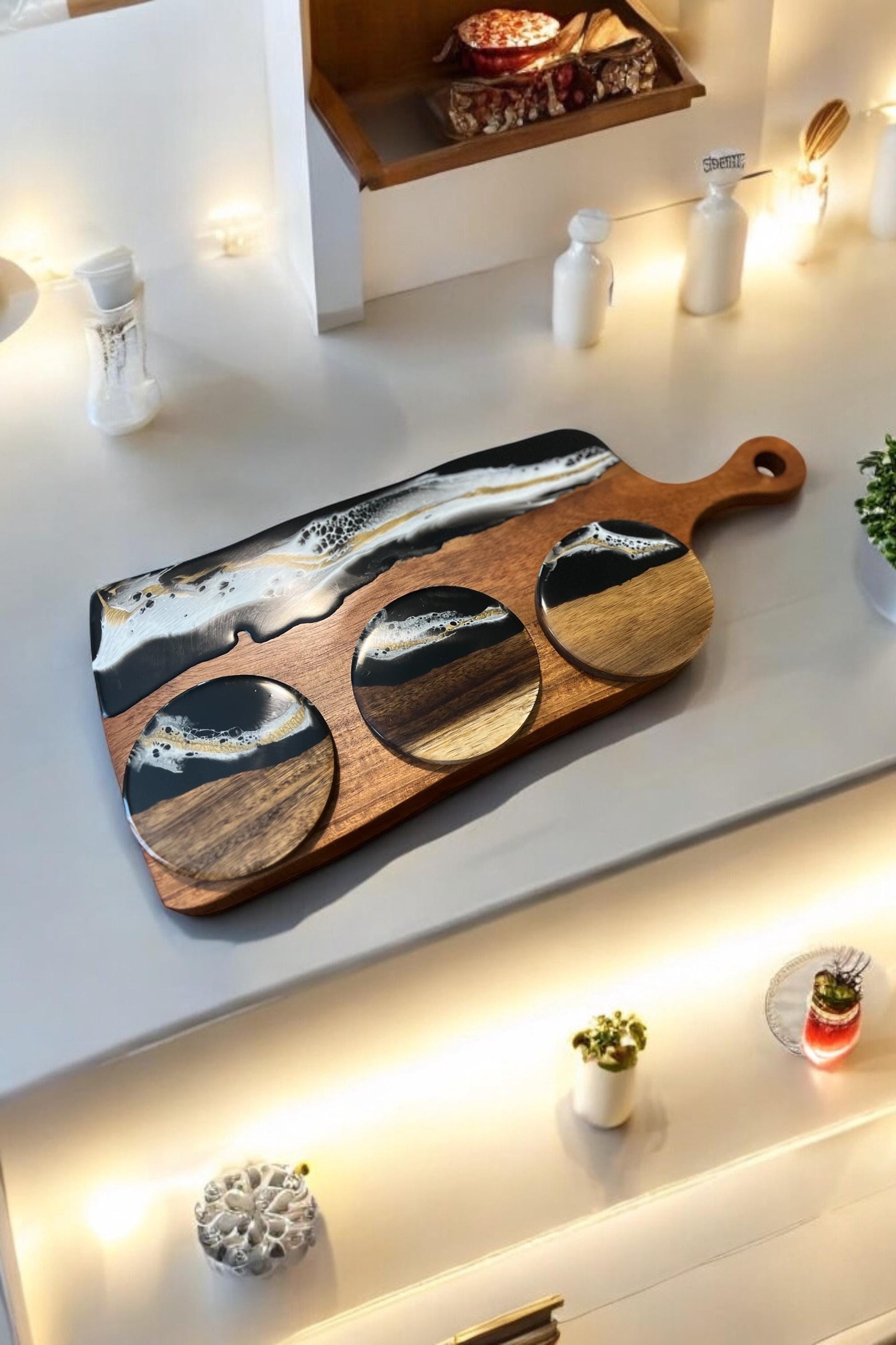 This gorgeous one of a kind resin serving board and matching coasters (3) is uniquely handcrafted and a visually stunning pieces that combines natural acacia wood with vibrant accents - sure