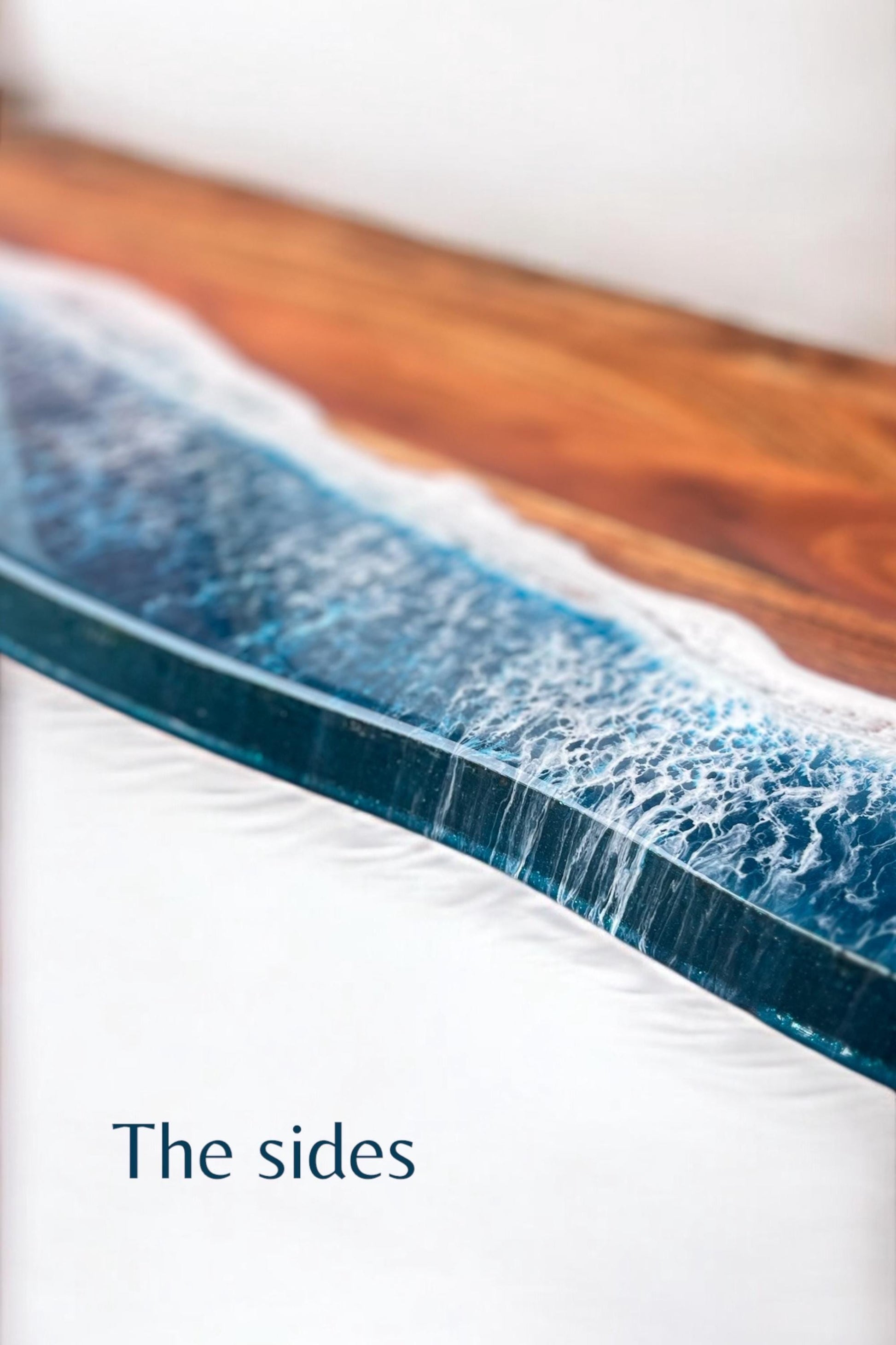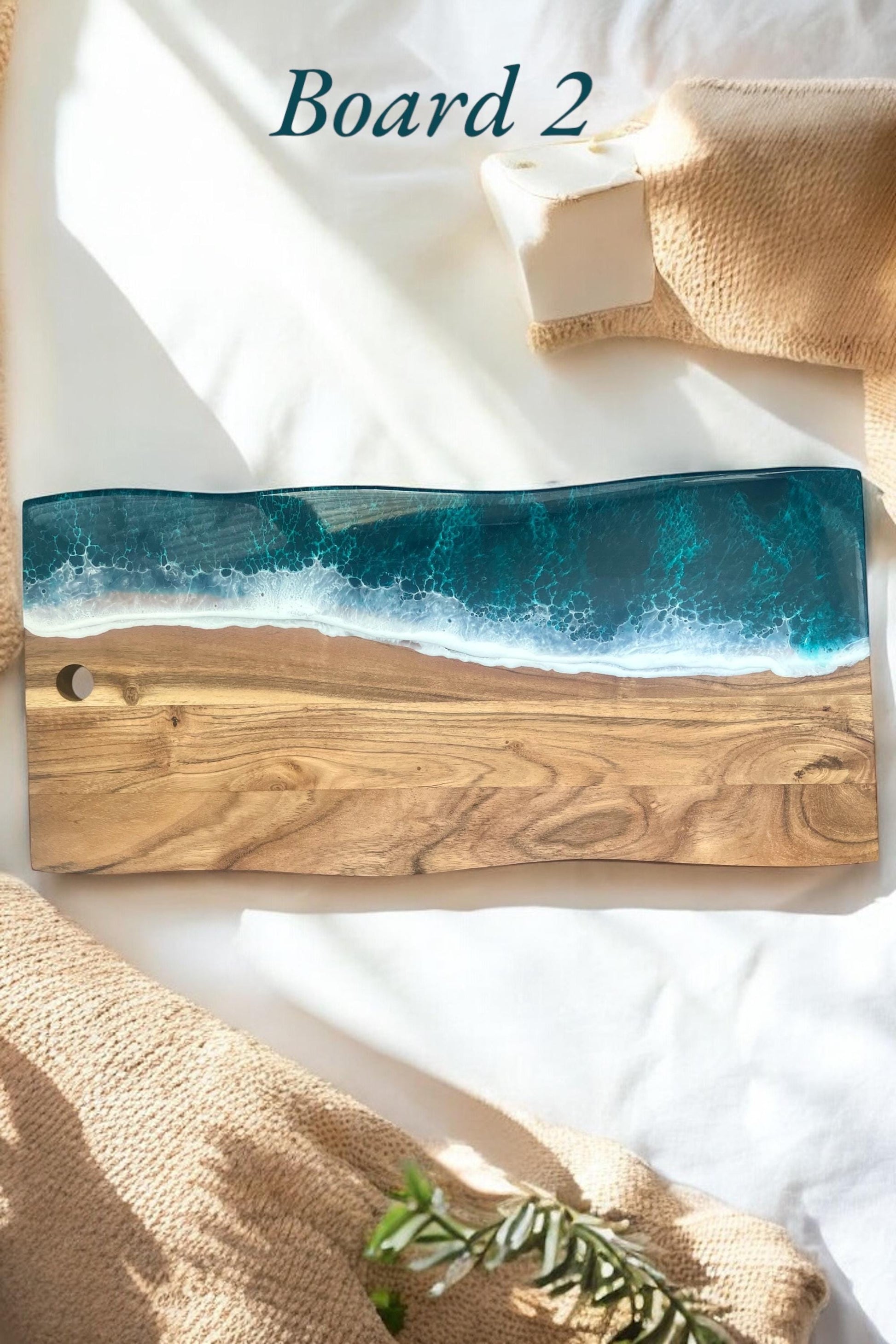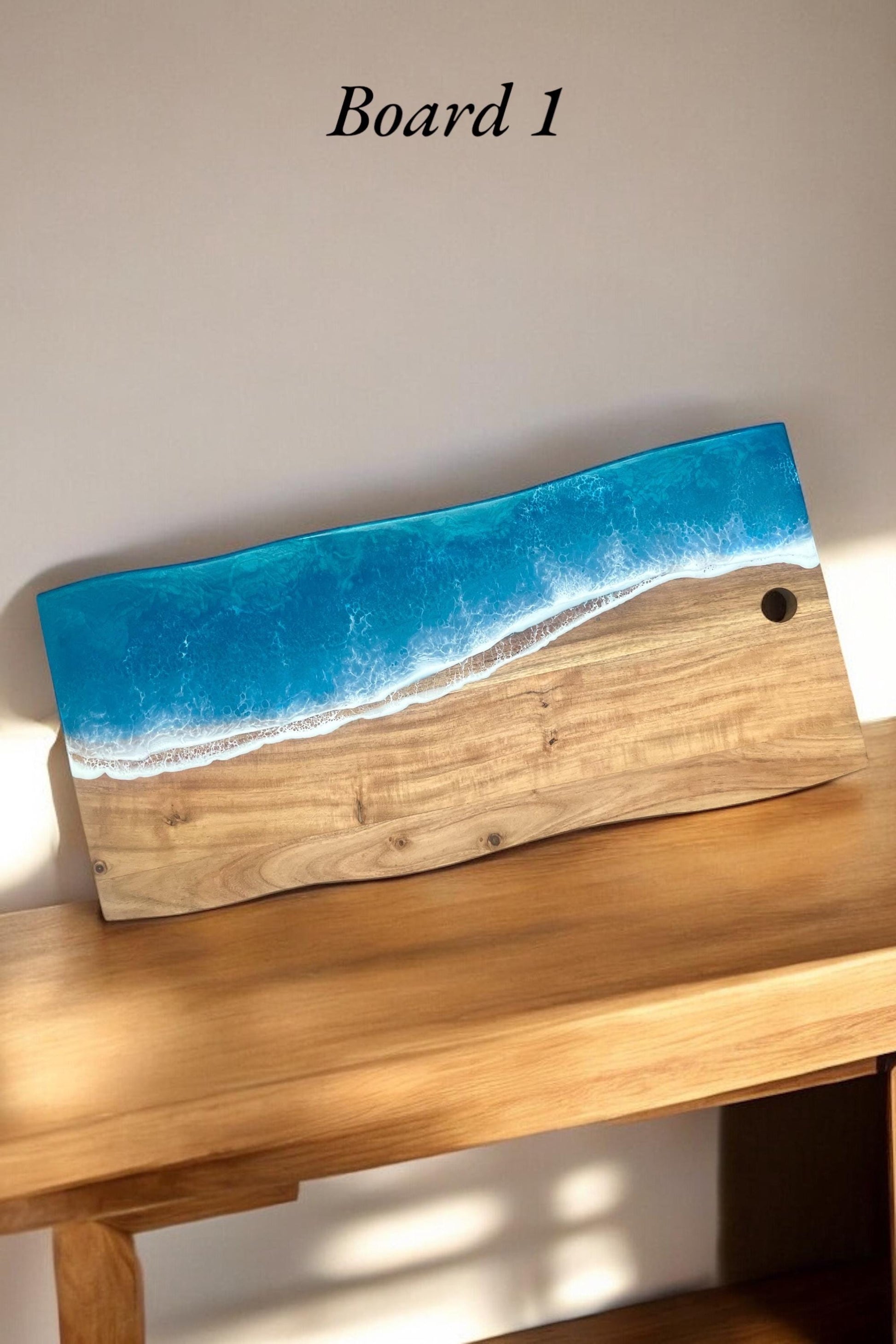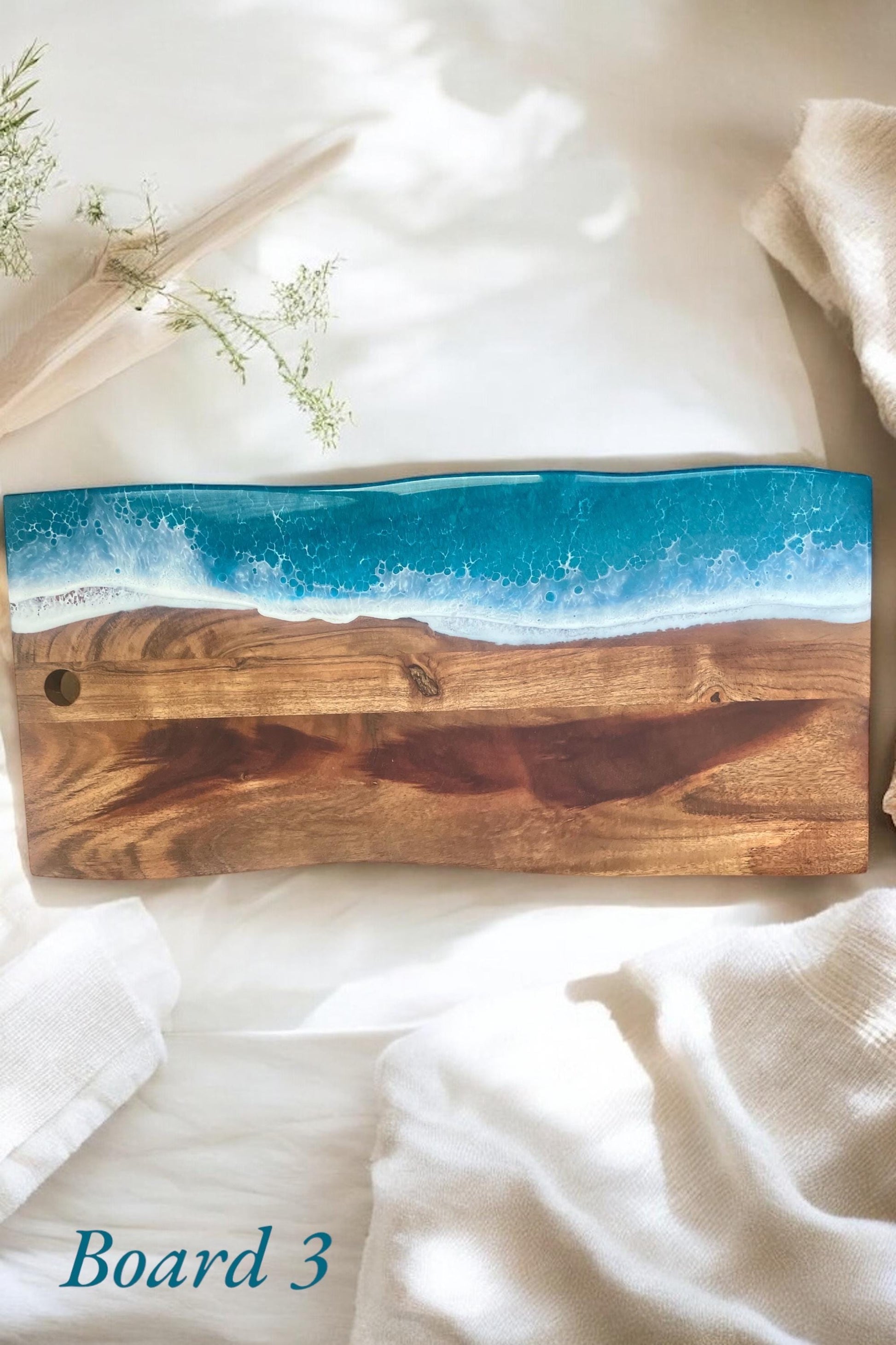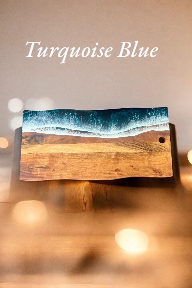 These gorgeous one of a kind resin coastal serving boards are uniquely handcrafted and visually stunning pieces that combines natural acacia wood with vibrant coastal wave accents.